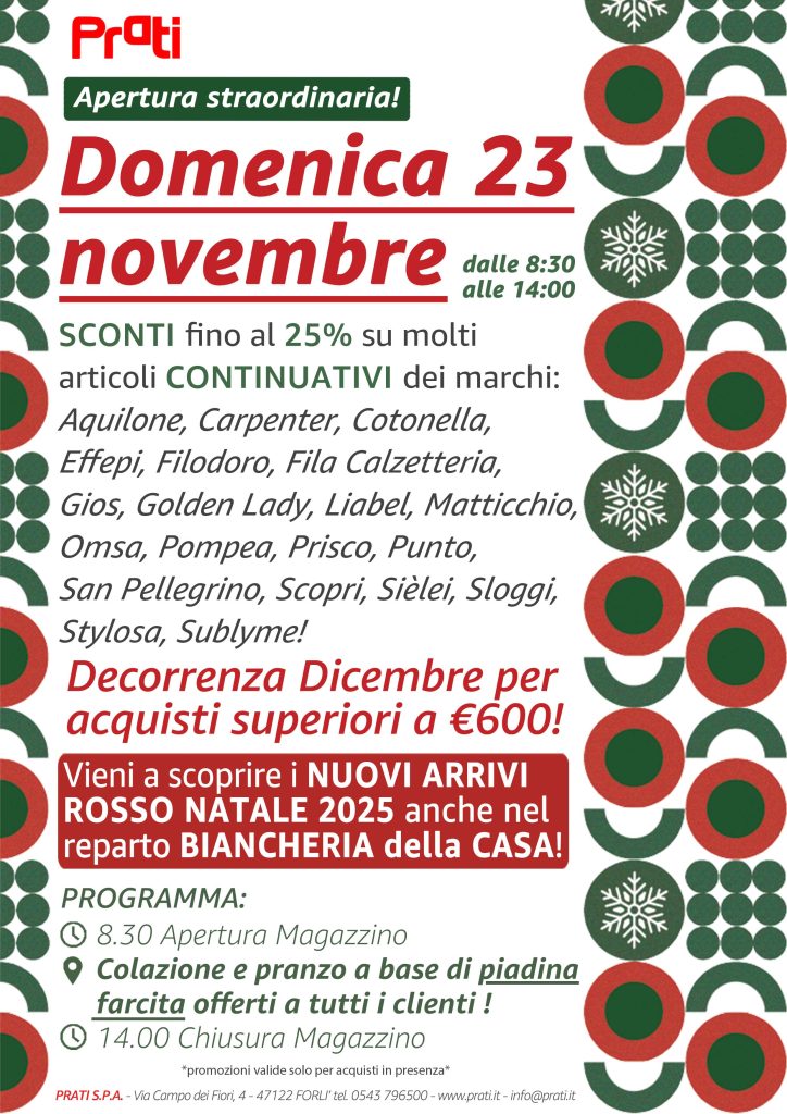 Domenica 23 NOVEMBRE APERTURA STRAORDINARIA ✨✨✨ Vi aspettiamo dalle 8:30 alle 14:00 con sconti fino al 25% su articoli continuativi dei migliori marchi! 🎄🎅 Vieni a scoprire i nuovi arrivi Rosso Natale 2025, anche nel reparto biancheria della casa! 🥐🥪 Colazione e pranzo a base di piadina farcita offerta a tutti i clienti! 💥 Decorrenza dicembre per acquisti superiori a 600€ 💥 📍 Vi aspettiamo nel magazzino di Forlì in via campo dei fiori 4! ° ° ° #Forlì #ingrosso #abbigliamento #intimo #Prati