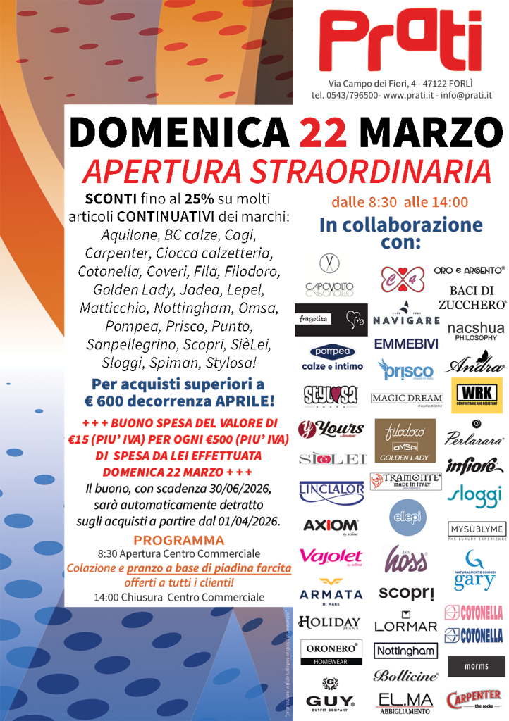Domenica 22 MARZO APERTURA STRAORDINARIA ✨ Dalle 8:30 alle 14:00 con sconti fino al 20% su articoli continuativi dei migliori marchi! 👉 Buono spesa di 15€ 👈 💥 Decorrenza APRILE per acquisti superiori a 600€ 💥 🥐🥪 Colazione e pranzo con piadina farcita offerta a tutti i clienti! 📍 Vi aspettiamo nel magazzino di Forlì in via Campo dei fiori 4! ° ° ° *solo su articoli selezionati in reparto. #Forlì #Prati #ingrosso #Prati_ingrosso #Intimo #Abbigliamento
